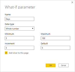 Days Value = SELECTEDVALUE('Days'[Days]; 5) // Medida para que apresenta o valor seleccionado e se for mais que um por defeito coloca 5