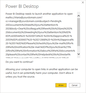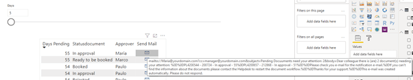 "mailto://" & SELECTEDVALUE ( Documents[Approver] ) & "@yourdomain.com" & "?cc=" & "manager@yourdomain.com" & "&subject=" & "Pending Docuuments need your attention: " & Document_Count & "&body=" & "Dear colleague there is (are) " & Document_Count & " document(s) needing your attention: " & NewLine & NewLine
