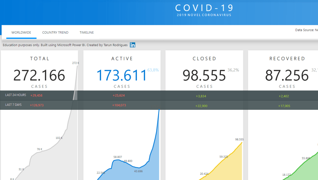 Como tal e sendo uma parte importante do meu dia-a-dia o Power BI decidi partilhar com vocês alguns links de relatórios que estão a ser feitos por vários utilizadores que nos permitem ter informação atualizada sobre esta emergência que hoje estamos a passar.