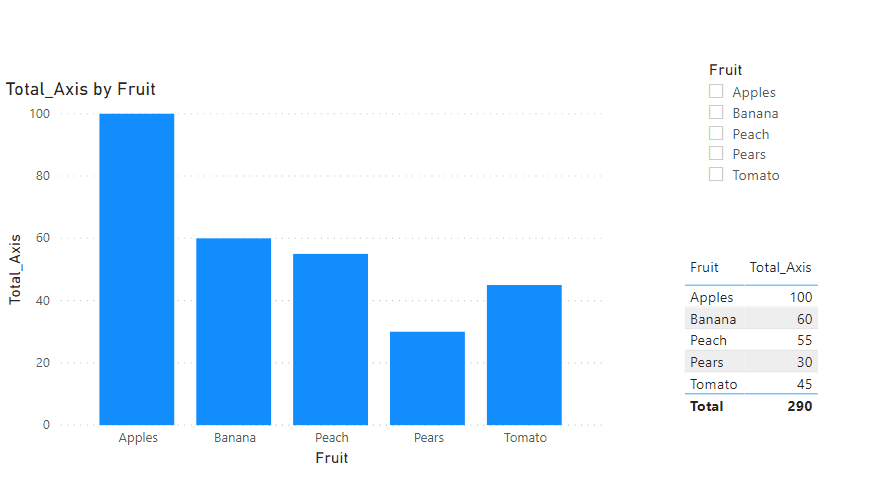 HASONEVALUE ( SELECTED_AXIS[Fruit] ); -- Validation Fruit Selection on the New Table