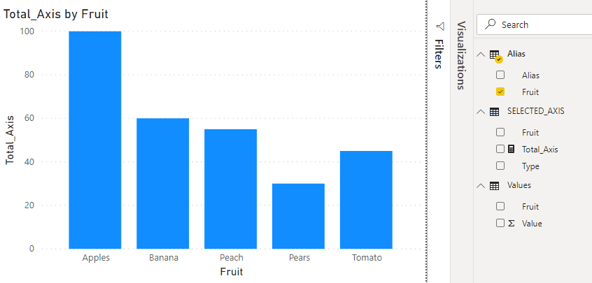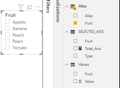SELECTEDVALUE ( SELECTED_AXIS[Fruit] ) IN VALUES ( Alias[Fruit] ) -- Check if Fruit selected in slicer (main table) is equal to the fruit selected on new table