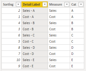 Measure_Category_Selection = CROSSJOIN(({"Sales", "Cost"} ), DISTINCT(Sales[Cat]))