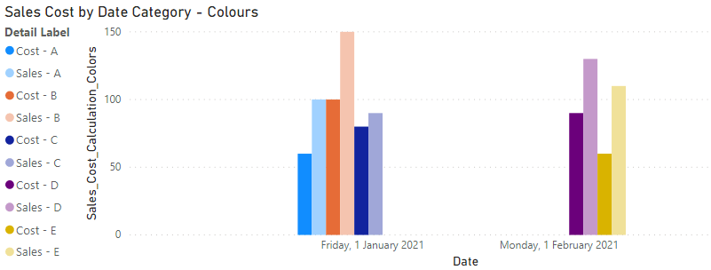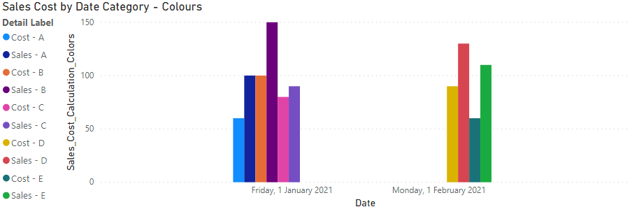 Vou dar 2 exemplos maneiras de apresentar a informação detalhada uma delas apresenta uma utilização da hierarquia no eixo do X, e a outra apresenta um detalhe maior conseguindo determinar cores individuais para cada conjugação de valores.