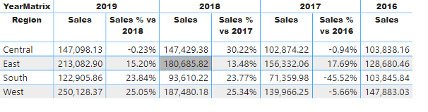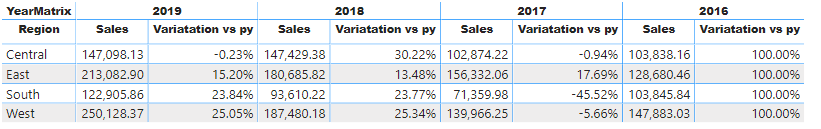 Considerando um modelo simples de vendas, queremos apresentar o cálculo da variação percentual do ano anterior, no entanto em vez de aparecer o nome simples de “Sales % vs PY” queremos substituir o PY pelo ano em questão.