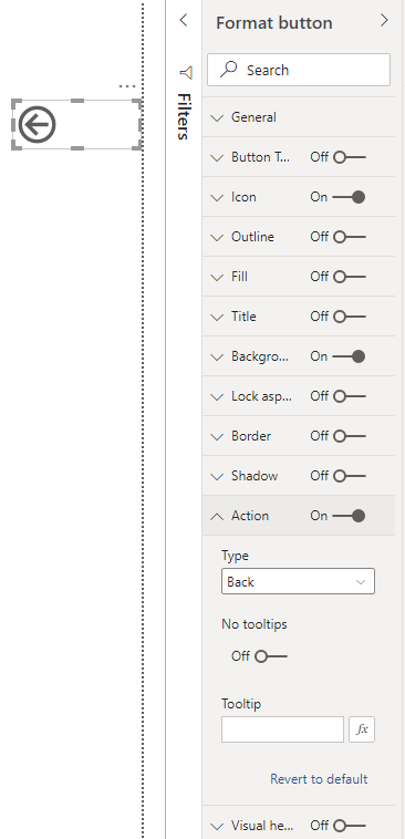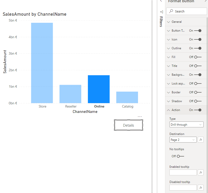 Quando ativamos o drill through é adicionado na página um botão de retrocesso para a página “principal”, sendo que se verificarmos as ações do botão o mesmo está associado ao “Retrocesso”.