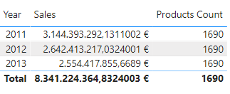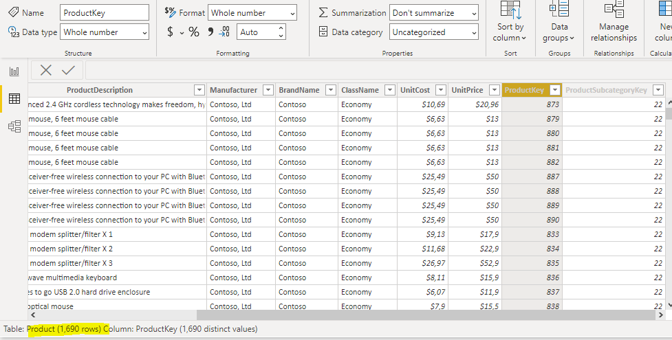 Como podemos verificar na imagem acima a contagem dos dados através da tabela dimensão Product devolve-nos o total de 1.690 em todas as linhas que é o total de linhas nessa mesma tabela: