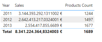 A confirmação desta informação pode ser feita através da tabela das vendas que tendo um filtro pelo ano de 2011 verificamos que o total de Product Key é de 1.244.