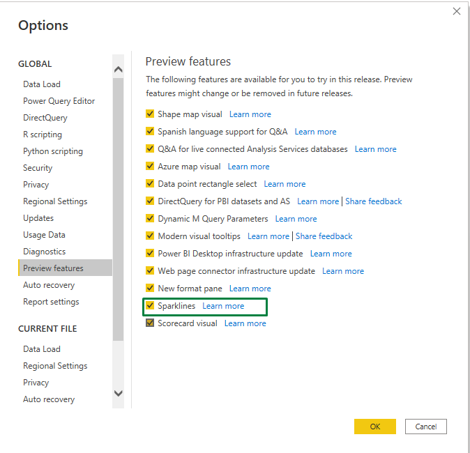 Sendo uma funcionalidade em preview no Power BI desktop temos de ativar a funcionalidade: