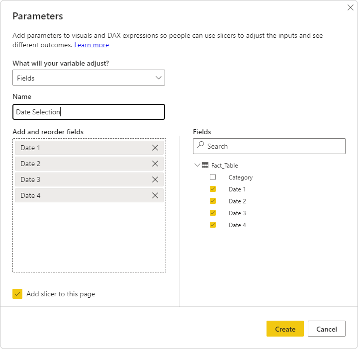 Para a criação dos Fields Parameters vamos optar por selecionar todas as colunas de data: