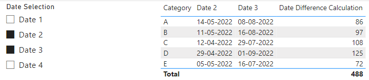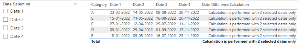 Como se pode verificar o cálculo realizado faz a diferença entre a Date 1 e Date 4, uma vez que se trata dos valores mínimos e máximos da seleção. Caso queiramos forçar que o utilizador escolha duas datas podemos “envolver” o resultado numa lógica de IF: