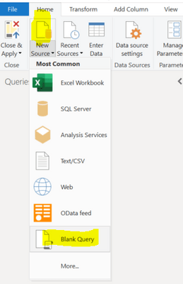 3- Criar “New blank query”: No Power Query -> Separador “Home” -> New Source -> Blank Query.