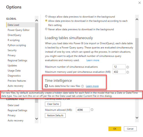 O Power BI tenta ajudar-nos com esta opção, mas por uma questão de performance deverá ser desligada (em Options -> Data Load -> Time intelligence -> desligar “Auto date/time for new files”).