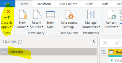 6- Renomear o query para “Calendário“: Clicar duas vezes no query criado, renomear para “Calendário” ou “Calendar” e de seguida, separador Home -> “Close and Apply”: