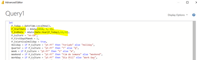 5.1- Mudar os steps P_StartDate e P_EndDate em conformidade (exemplo, se quiseres que a data de início seja 01/01/2020, no passo P_StartDate substituir o ano 2018 por 2020; se pretenderem que a data de fim seja o dia 31/12 do ano corrente (dinâmico) poderão deixar o P_EndDate inalterado; se preferirem, por exemplo, que a data de fim do calendário seja o fim do ano do ano anterior ao corrente, bastará inserir “-1” depois de “Date.Year(P_Today)” – algo deste género: “Date.Year(P_Today)-1, 12, 31)”.