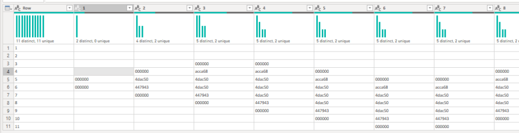 Source = Table.FromRows(Json.Document(Binary.Decompress(Binary.FromText("pZM7DoAgDEDvwszgpyKehTAQvP8ZDKaEqlCLkg4d6HtNKc6pUWnFx3AemqTw2qlJWBhiDMbSpKASZ35xtYGwh7gMNLkrEh86+hGLSgLrBvPVuFAIU/ts4Jca52ku9nxH0sZHKXrX2/Qk6m4Ruuzzsfp0LTjyt+ricQoGiMyxudCFy1MyqPJr+a+Ti/0B", BinaryEncoding.Base64), Compression.Deflate)), let _t = ((type nullable text) meta [Serialized.Text = true]) in type table [Row = _t, #"1" = _t, #"2" = _t, #"3" = _t, #"4" = _t, #"5" = _t, #"6" = _t, #"7" = _t, #"8" = _t, #"9" = _t, #"10" = _t, #"11" = _t, #"12" = _t, #"13" = _t, #"14" = _t]),
