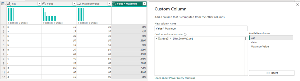 #"Added Custom" = Table.AddColumn(#"Expanded Grouped Rows", "Value * Maximum", each [Value] * [MaximumValue]),