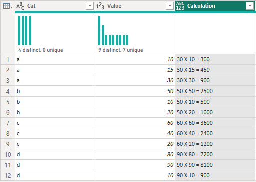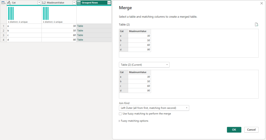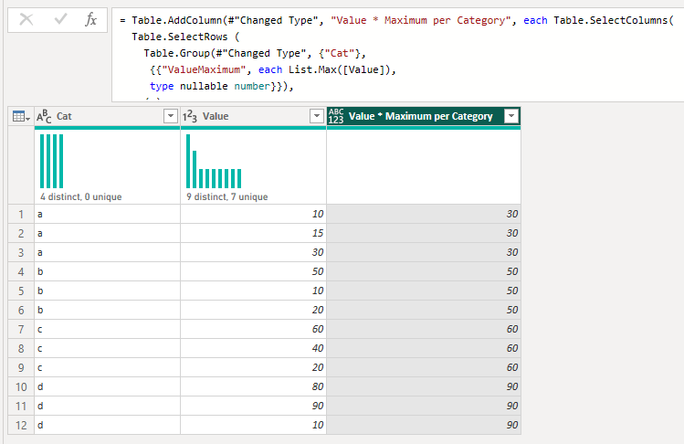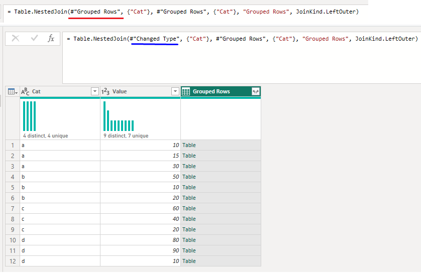 #"Merged Queries" = Table.NestedJoin(#"Changed Type", {"Cat"}, #"Grouped Rows", {"Cat"}, "Grouped Rows", JoinKind.LeftOuter),