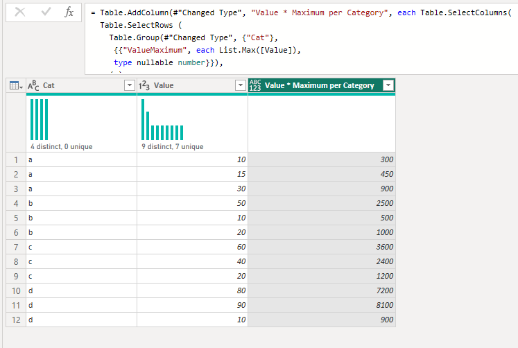 #"Added Custom" = Table.AddColumn(#"Changed Type", "Value * Maximum per Category", each Table.SelectColumns(