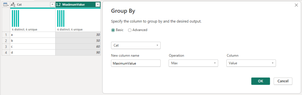 #"Grouped Rows" = Table.Group(#"Changed Type", {"Cat"}, {{"MaximumValue", each List.Max([Value]), type nullable number}}),