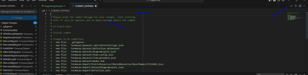 O commit obriga-nos a introduzir uma mensagem, como boa prática devemos utilizar um resumo das alterações, no entanto podemos colocar qualquer texto: