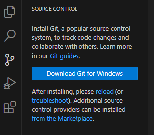 Ao acedermos a funcionalidade do Source Control (botão identificado na imagem) temos a opção de download Git for Windows: