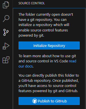 Depois da instalação e de reiniciarmos o Visual Code, temos então a opção de inicializar um repositório ou publicar para o GitHub (conta gratuita)