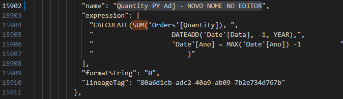 Conseguimos claramente perceber as principais características da nossa medida como o seu nome, expressão e formato, sendo que a sua edição pode rapidamente ser realizada no ficheiro sem necessidade de abrir o Power BI Desktop. Neste caso alteramos o nome da métrica para Quantity PY Adj – NOVO NOME NO EDITOR: