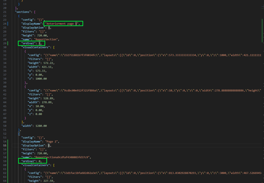 O código realçado mostra as propriedades da página 1 sendo que conseguimos identificar que temos duas visualizações do nosso relatório vamos olhar melhor para o código de cada uma das visualizações: