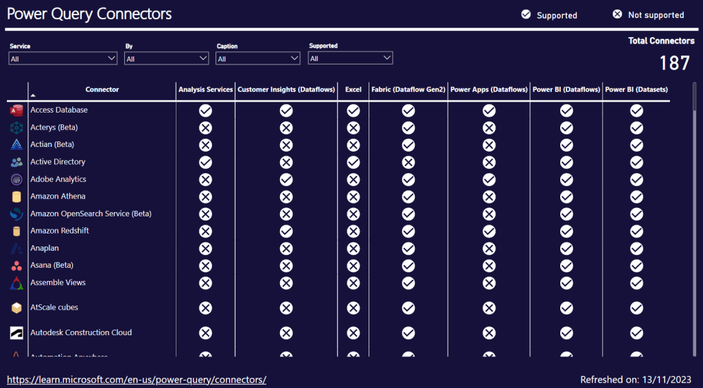 A informação sobre estas ligações está disponibilizada no site da MSFT (Power Query Connectors) sendo que apresenta informação sobre os seguintes serviços: