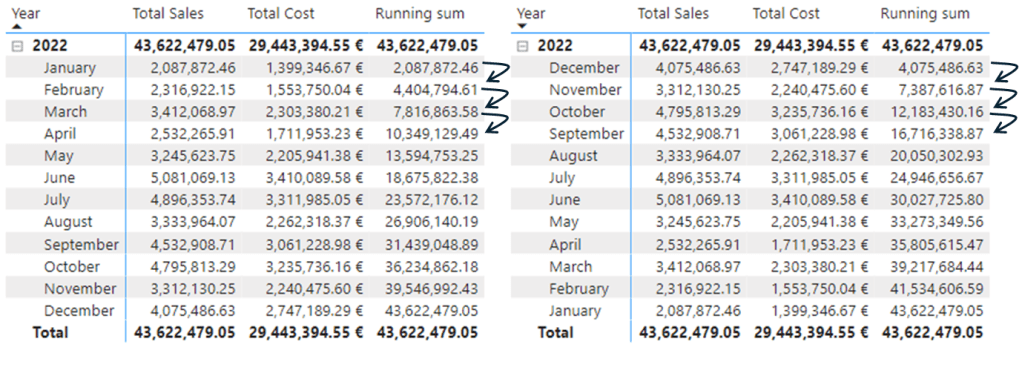 Na primeira imagem verificamos que temos a ordenação de janeiro para dezembro e o nosso cálculo é realizado nessa ordem, no entanto se invertermos a ordem dos meses vemos que o cálculo vai acompanhar a ordenação dos campos e passamos a ter um valor cumulativo de dezembro para janeiro