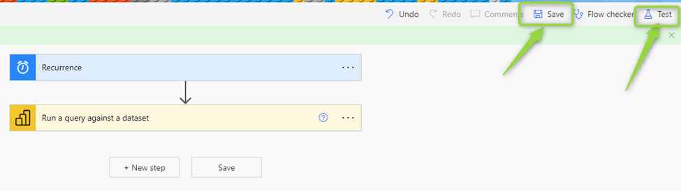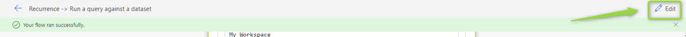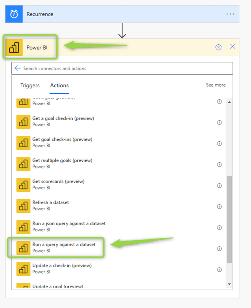 Vamos selecionar as ações para o Power BI e escolher “Run a query against a dataset”