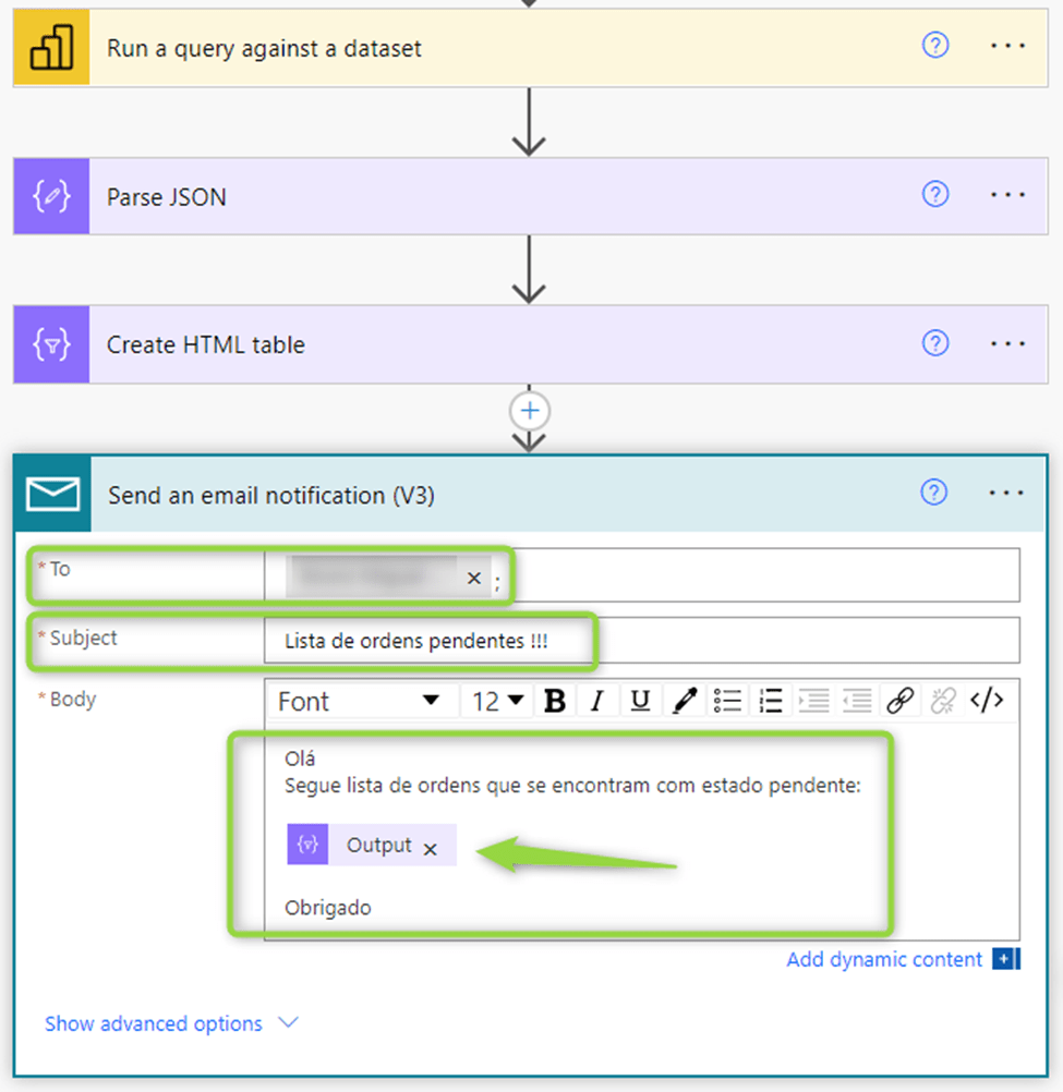Chamo a atenção que optamos por criar “Custom columns” de modo a ir buscar a informação ao JSON. Assim temos uma tabela HTML que podemos usar no corpo de e-mail.