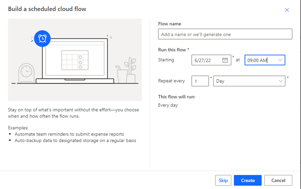 Escolher “Scheduled cloud flow” de modo a criarmos uma recorrência diária